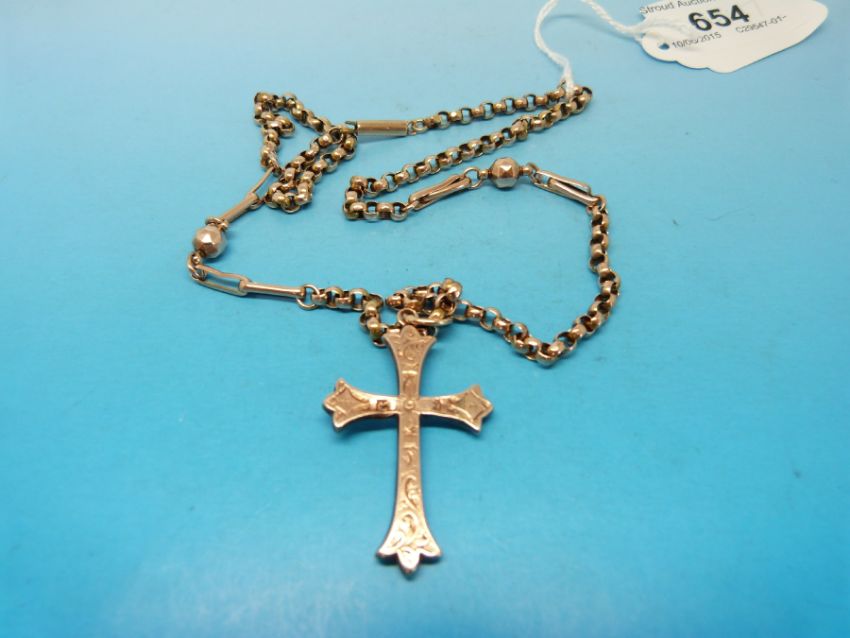 A yellow metal watch chain marked 9ct with a hallmarked 9ct gold cross (11.1g)