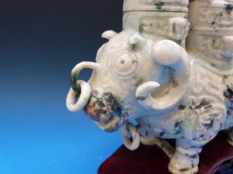 A large Chinese jadeite figural lidded vase and cover in the form of an archaistic buffalo, the vase with three openings and dragon finial, on fitted wooden stand (32cm - 49cm including stand)