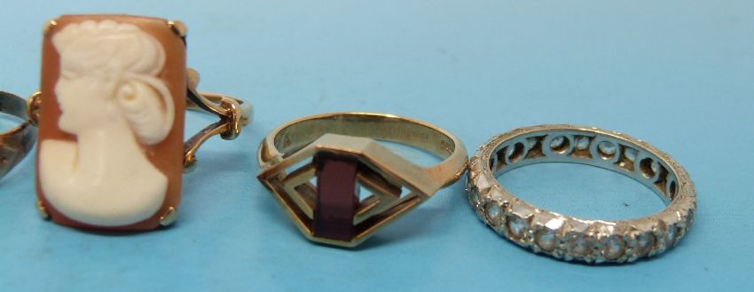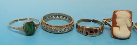 Three hallmarked 9ct gold rings two set with garnets and one with cubic zirconia, two yellow metal rings marked 9ct gold and one other ring