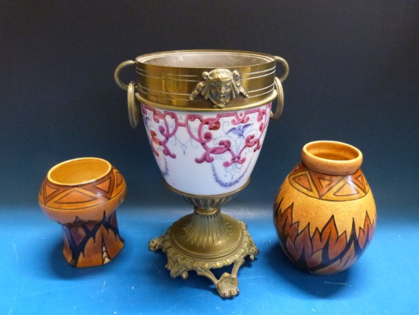 A Minton part toilet set, Clews chameleon vases and a brass and ceramic and brass ice bucket, possibly Sevres