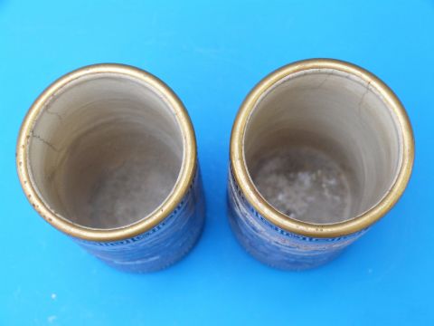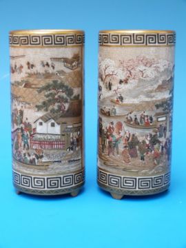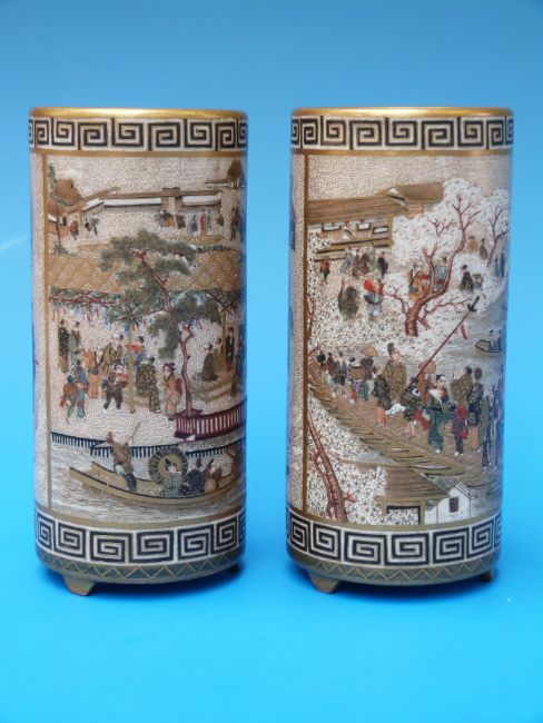 A fine pair of Japanese Satsuma cylindrical vases, the body decorated with river scenes between bands of Greek key border. Gold seal mark in the manner of Meizan, Meiji period (Approx 11.8cm tall)