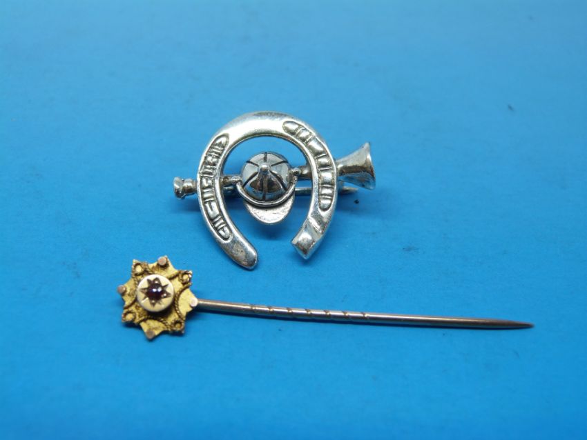 A 9ct gold stick pin set with a ruby and a silver brooch in the form of a horseshoe