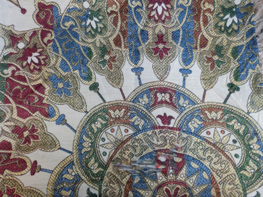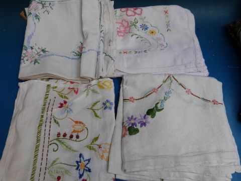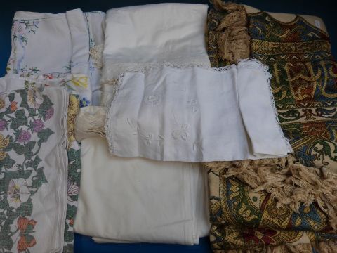 An Egyptian embroidery throw, vintage linen, nightdress with lace adornment