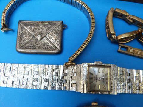 A collection of costume jewellery to include ladies wristwatches, silver chains, hallmarked silver stamp holder, silver locket, hallmarked silver bracelet etc