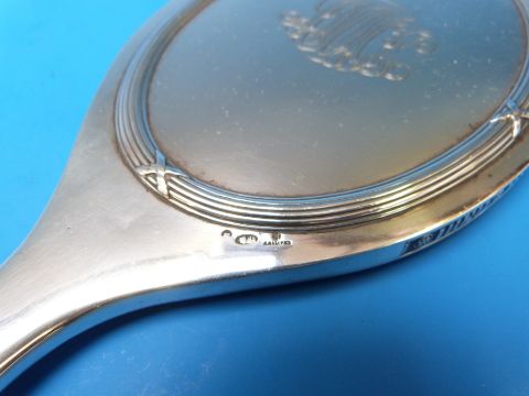 A Fabergé silver hand mirror with ribbon decoration to the back, banding to the front around the oval mirror and line and floral decoration to the edge. Bearing the second Kokoshnik mark (1908-1926), Moscow assay mark and Fabergé mark