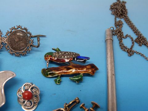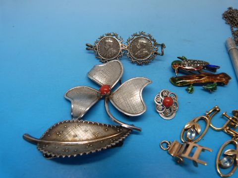 A silver brooch in the shape of a clover/shamrock set with a coral to the centre, a silver and enamel brooch depicting a woodpecker on a tree set with marcasite, white metal pen etc