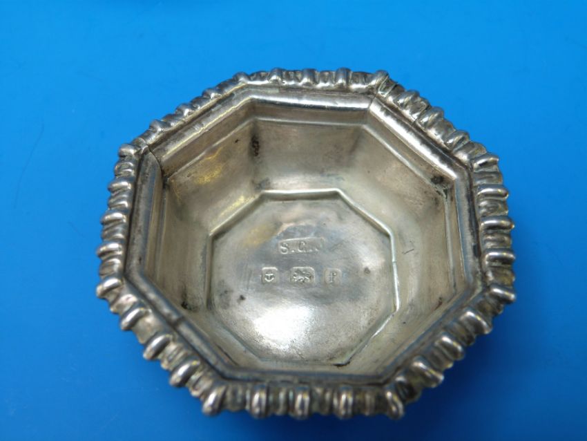 A pair of hallmarked silver octagonal salts together with a pair of hexagonal salts with gilt interior marked Daniel Low & Co. Sterling (59g)