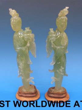 A pair of bowenite Chinese figures on wooden plinths with inscription to base "Presented by the Directors of Liberty in 1958" (30cm tall)