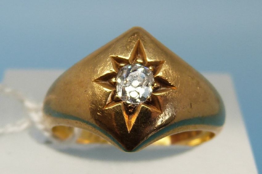 A Victorian 18ct gold ring set with a diamond in a star setting, engraved to the inside 'Tirranna Races 1873' (Australian interest, size L) (5.9g)