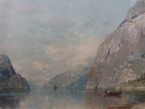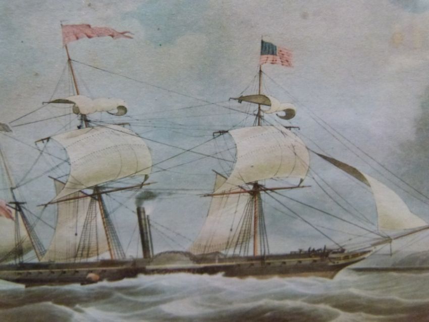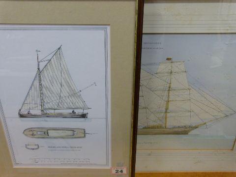 A print of a Mersey and Irwell canal boat, framed rigging plan of a sailing ship, oak framed print of a fjord, nautical prints and engravings etc