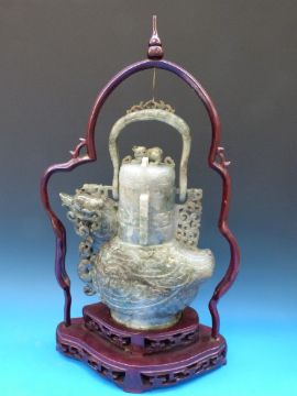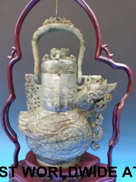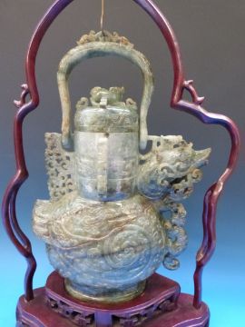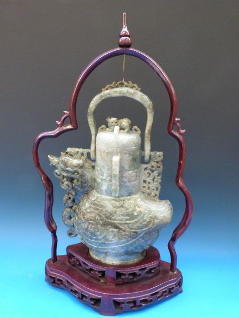 A Chinese jadeite figural lidded vase in the form of an archaistic bird, with areas of pale brown inclusion, on fitted wooden stand (50cm including stand)