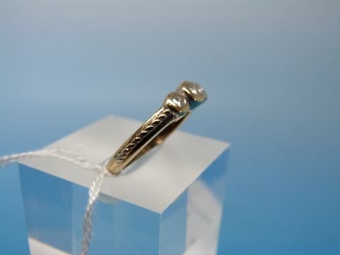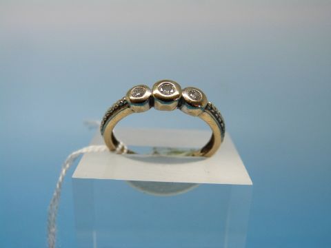 A 9ct gold ring set with three diamonds in a rubover setting with textured shoulders (size P)
