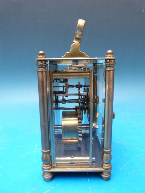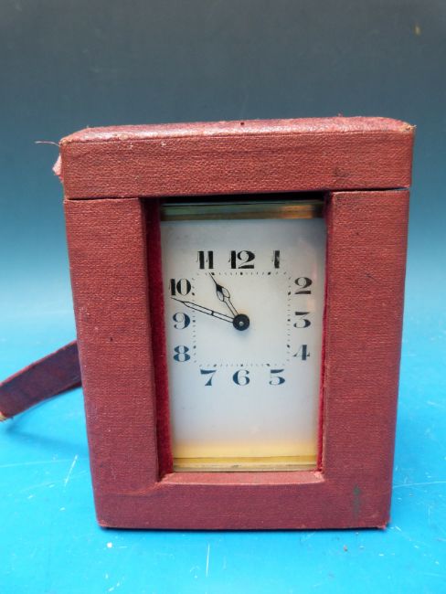 A mid 20th century brass carriage clock with Arabic numerals and a painted dial with 'skeleton hands', in original carry case