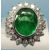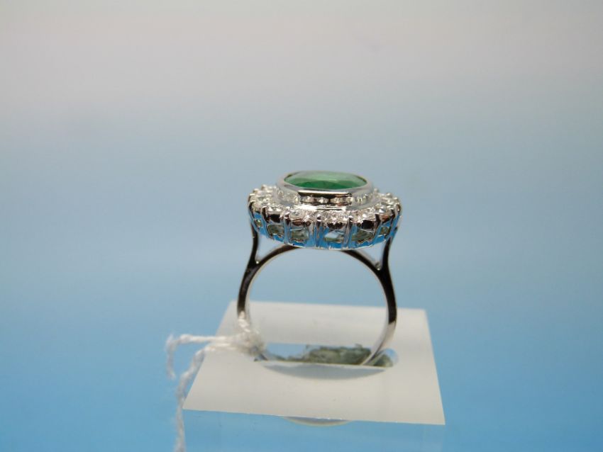 A white metal ring marked 750 set with an oval cut emerald measuring approximately 3.5ct surrounded by round brilliant cut diamonds (size O)