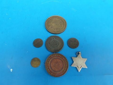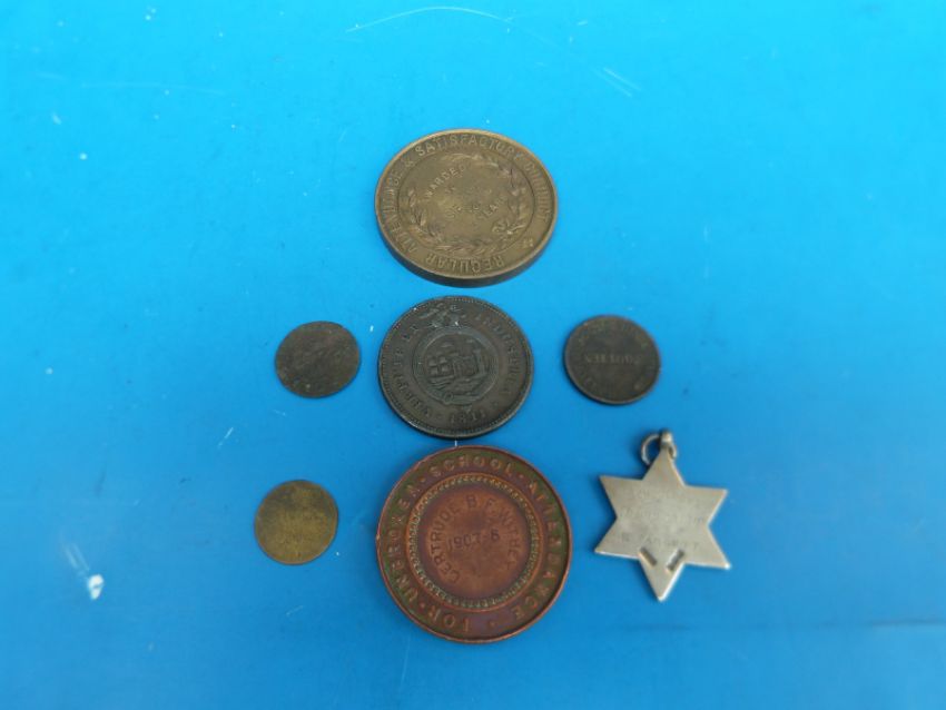 A small collection of local tokens including a 19thC Wotton-Under-Edge ¼d, a 1669 Wickwar ¼d and a Dursley ¼ Fleece, a Bristol token of 1811 together with two Victorian attendance medals and a silver 1911 example
