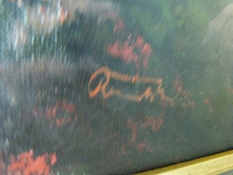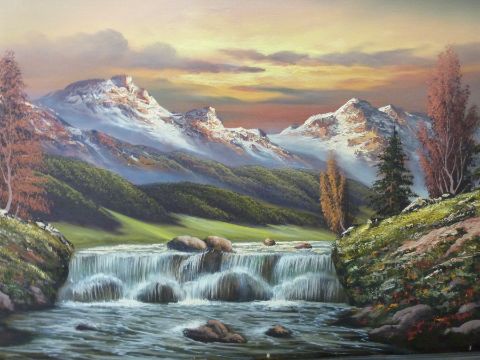 An oil on canvas of a river with waterfall in a mountainous landscape (48 x 98cm)