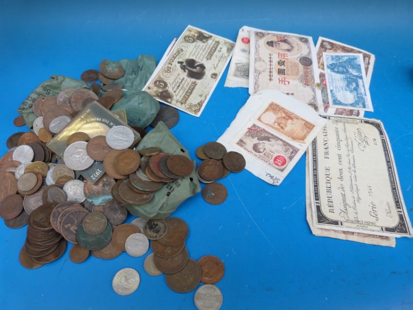 A quantity of English and overseas (East Africa, British, West Africa etc) coinage 19thC onwards including a good collection of Victorian pennies and some reproduced bank notes (and various tourist copies)