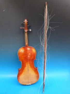 A Stradivarius copy violin, 36cm back with bow