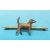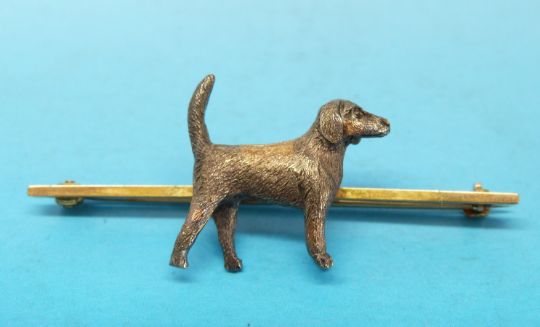 A yellow metal bar brooch set with a foxhound marked 9ct (in original box, Hardy Bros, Australia)