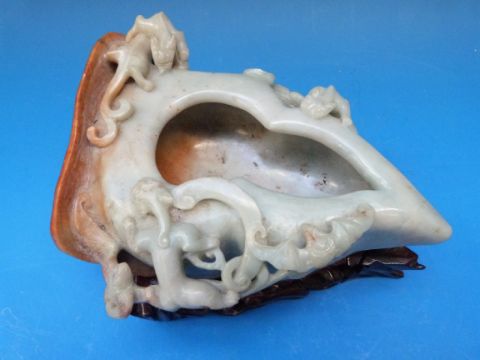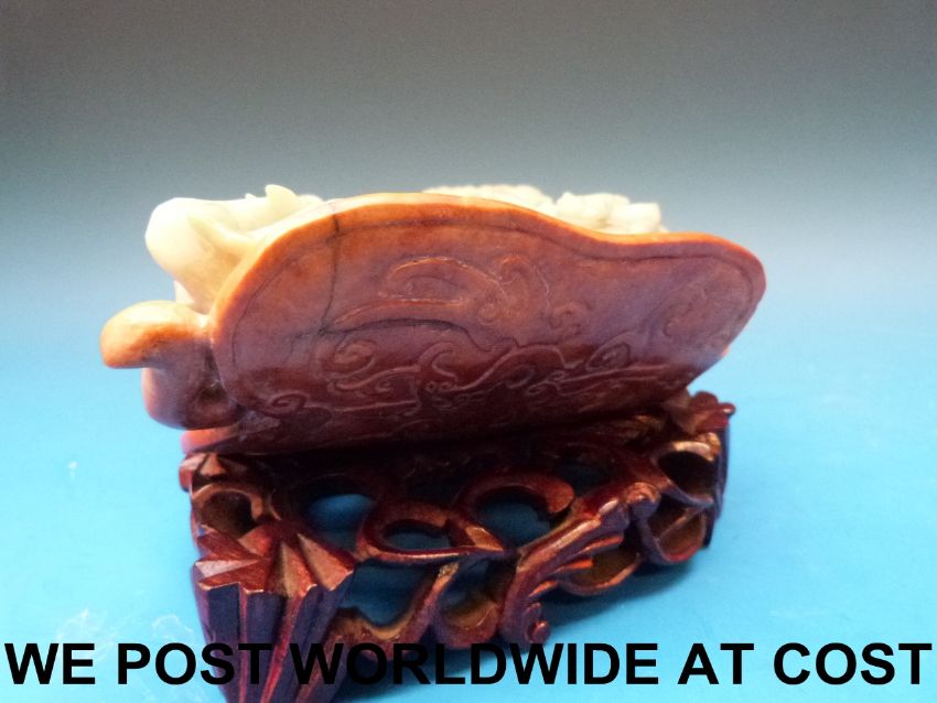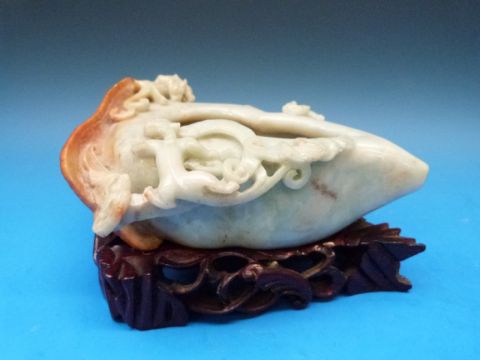 A Chinese jadeite brush washer in the shape of a peach carved in relief with scrolling chilong, on pierced wooden stand (6cm - 9cm including stand)