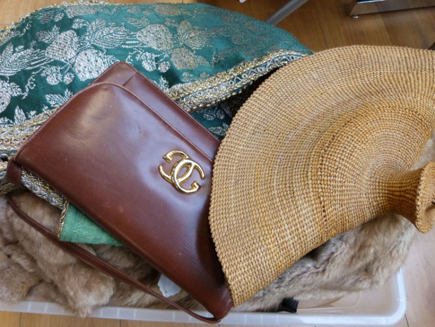 A fur coat together with a stole, eiderdown, academic gown etc and an Eastern Djelleka with ornate gold and silver thread embroidery