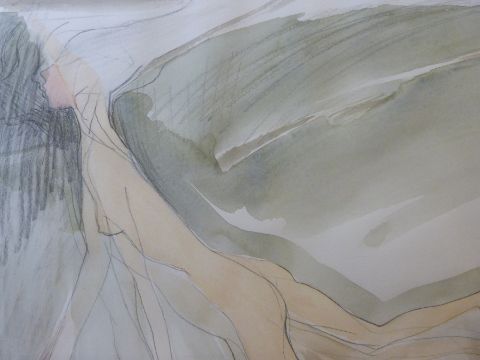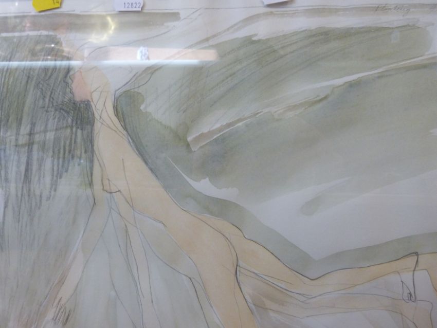A framed and glazed watercolour drawing of a nude study 'Floating', signed and titled upper right John Doubleday (44cm x 44.5cm). Doubleday is a figural sculptor who studied at Goldsmiths College, London, who mostly worked in bronze. Patrons include HRH Prince Phillip.