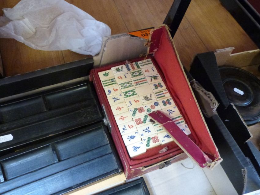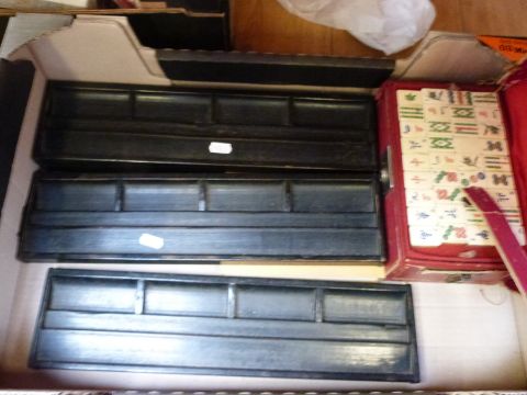 A cased bone and bamboo Mah Jong set with holders and instructions