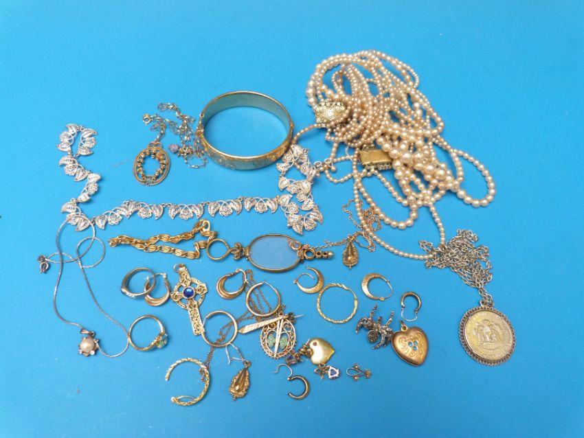 A collection of yellow metal and gold earrings and pendants, white metal filigree necklace, Edwardian yellow metal pendant marked 9ct set with seed pearls etc