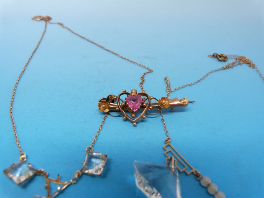Two Art Deco 9ct gold necklaces set with quartz and a 9ct gold sweetheart brooch