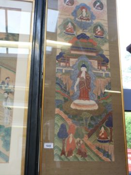 A pair of Chinese paintings of court scenes together with a Tibetan thangka (tallest 83cm)