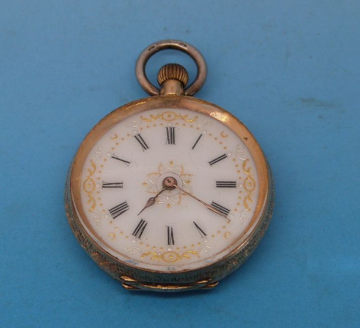 A yellow metal cased keyless wind pocket watch stamped 18k