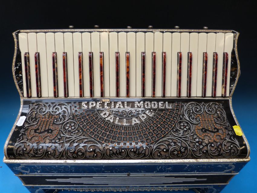 A rare 140 bass Italian piano accordion The Dallape 'Special Model' in black oynx finish, embellished with 'gold glitter' banding and inlaid with diamanté, tortoiseshell sharps to keyboard and treble couplers (in shaped case)