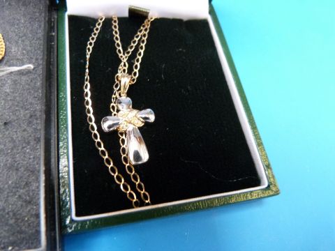 Two silver necklaces, a yellow metal necklace, three 9ct gold necklaces one set with sapphire and diamond