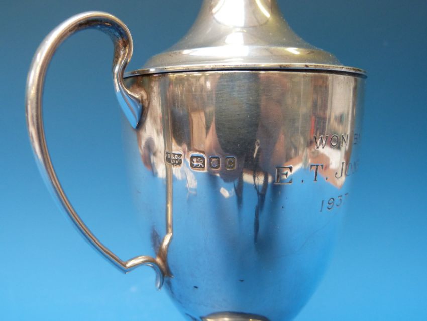 A hallmarked silver lidded trophy cup 'The Wafflers Club' London 1938, maker's mark S&Co.Ltd, on ebonised base. Height 26cm, weight of silver 315g