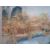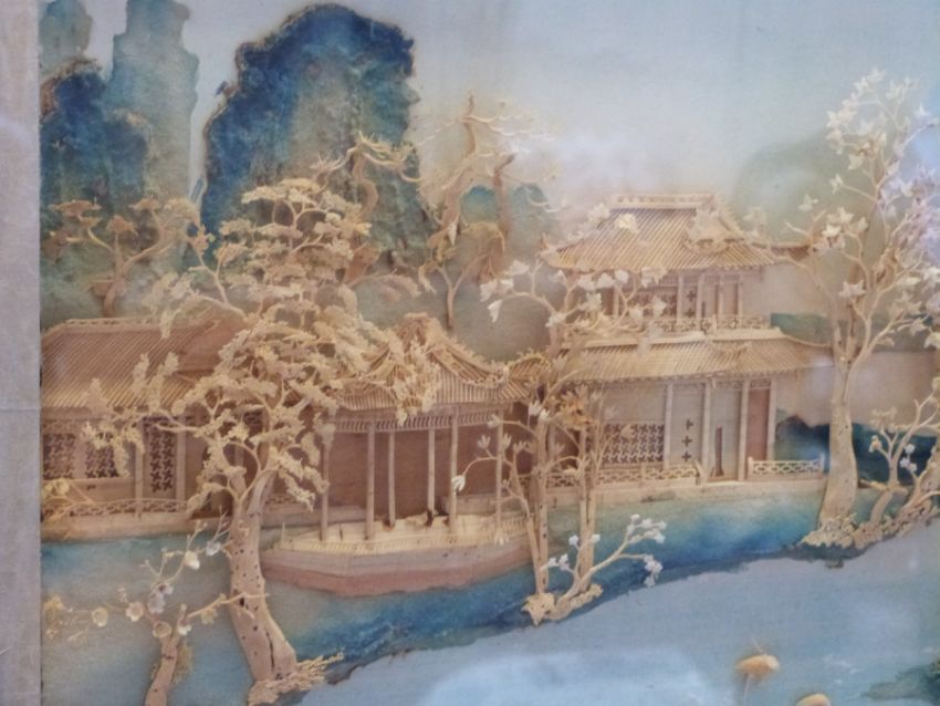 A Chinese cork picture of buildings and trees by a river (32 x 52cm)