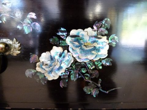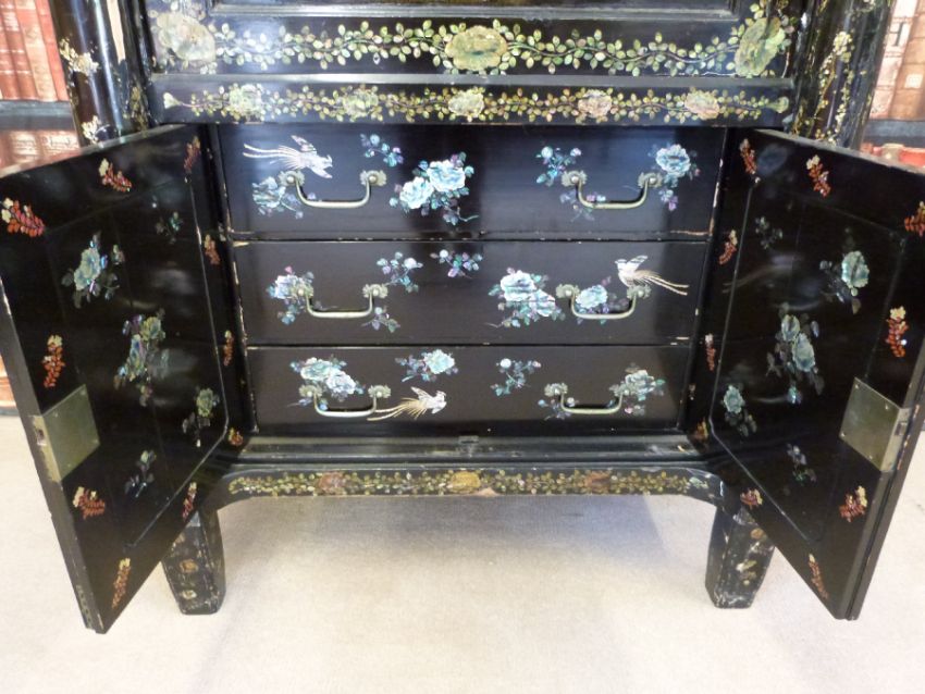 An impressive inlaid lacquered Japanese secret with a single top drawer over a fall flap which opens to reveal a fitted interior and cubby hole. The two doors to the base of the cabinet open to reveal three straight drawers. The cabinet is framed either side by two circular tapering pillars and is inlaid hand decorated profusely, inside and out with abalone mother of pearl and gilt to show a central village scene beneath mountains, birds of paradise, chrysanthemum, prunus blossom, flowers and foliage (W96 x H150 x D48)