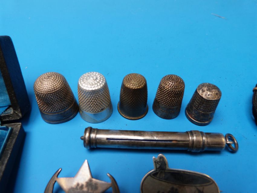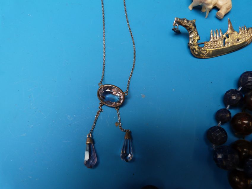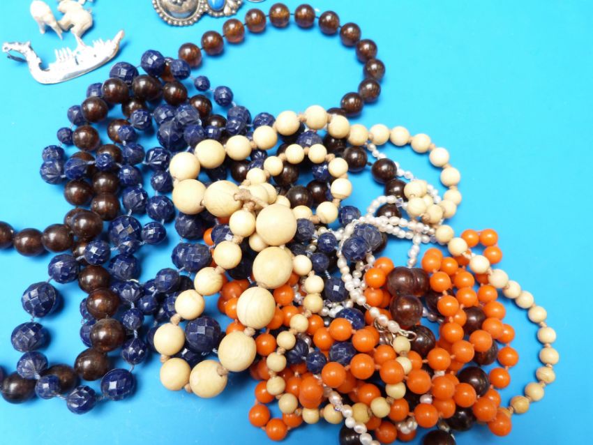 An ivory bead necklace together with a quantity of other necklaces, Niello ware brooches, silver thimbles, silver pencil etc