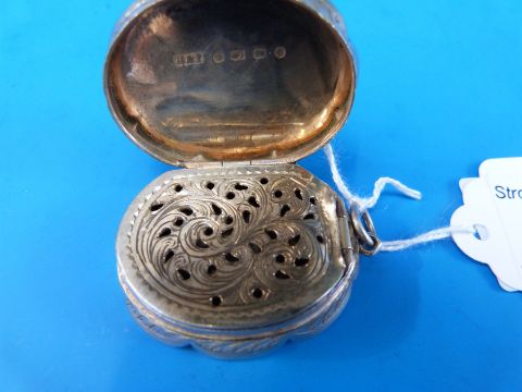 A Victorian vinaigrette mounted on a loop, of oval form with pierced inner cover, Birmingham 1881 maker Hilliard & Tomason