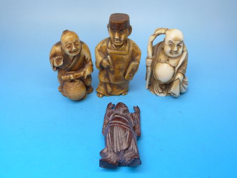 Four Japanese netsukes including an artist and Hotei