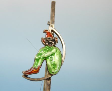 A silver brooch set with an enamel figure and a small ceramic plaque decorated with two cherubs set into a brooch