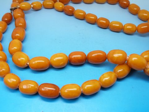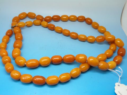 An amber necklace formed of 60 oval egg yolk coloured beads each measuring 1.9cm x 1.4cm (125g)
