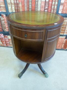 A reproduction library drum table with leather inset top (D50 x H73cm)