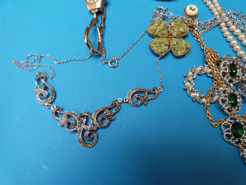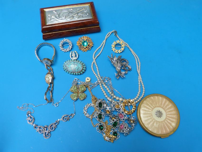 A collection of jewellery to include brooches, necklaces and two 9ct gold cased ladies watches one on 9ct gold strap