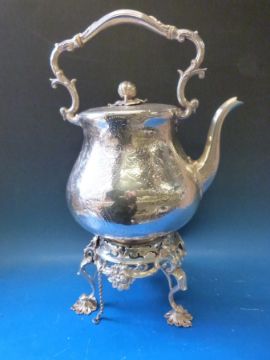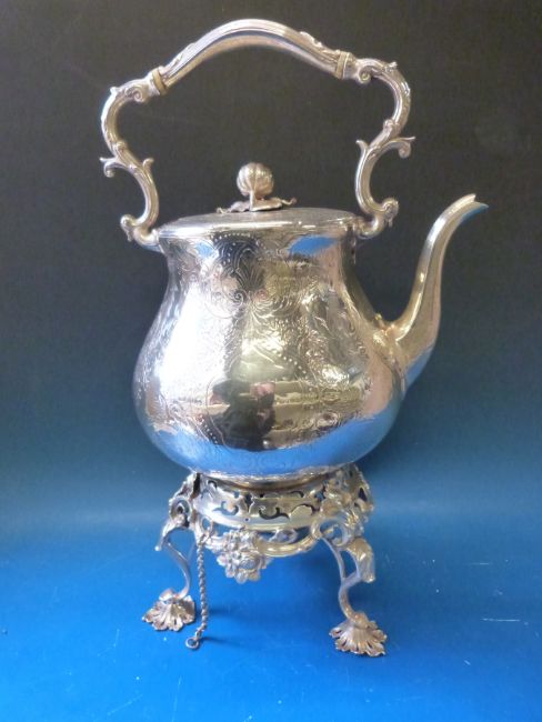 A large 19thC silver plated spirit kettle on ornate stand, height 43 cm