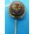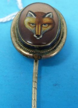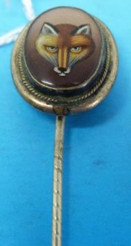 A 19thC stick pin set with a fox's head painted on glass with rope border