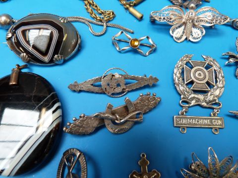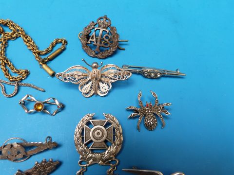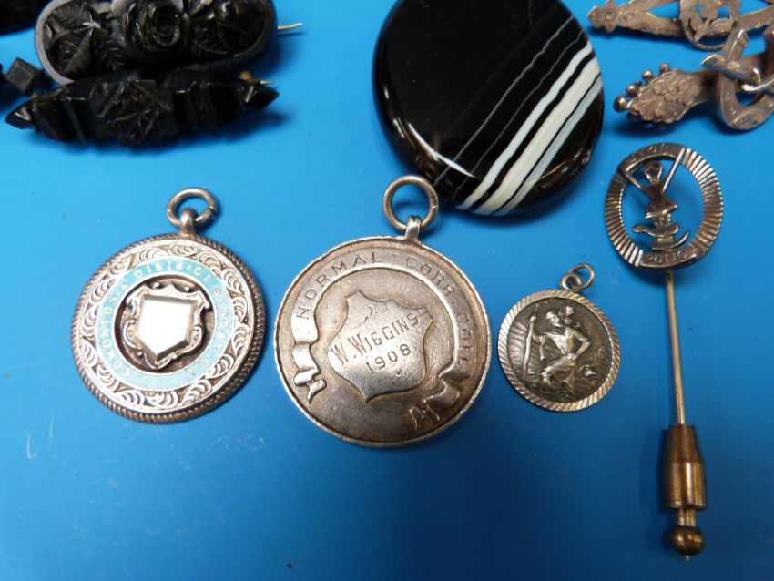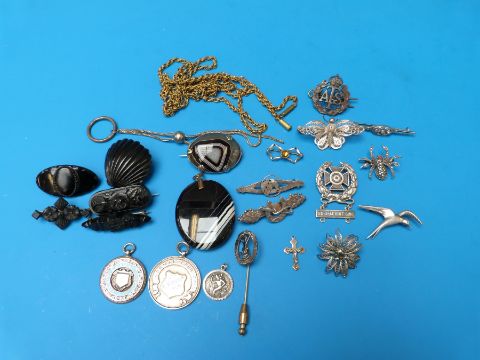 A quantity of brooches to include silver hunting and sweetheart examples, marcasite brooch in the form of a spider, Scottish agate and jet; two silver medals etc