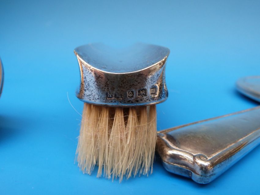 Two Art Nouveau design hallmarked silver mounted hand mirrors, one having stylized lady design together with a pair of hallmarked silver brushes and a small hallmarked silver circular photograph frame