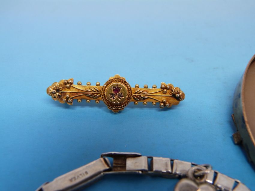 A yellow metal brooch marked 15ct set with diamonds and a ruby, a cameo brooch depicting a classical figure with harp together with a white metal charm bracelet