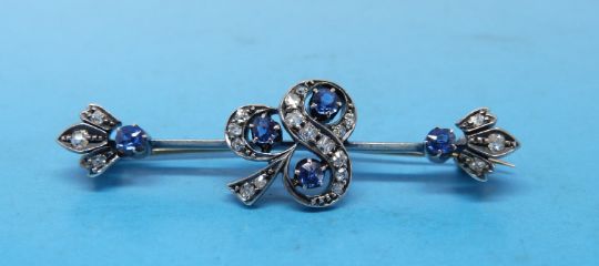 A yellow metal brooch set with diamonds and sapphires in the shape of a clover/shamrock