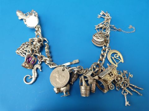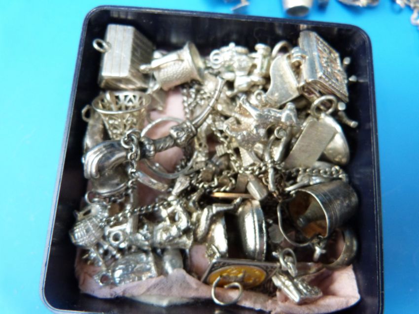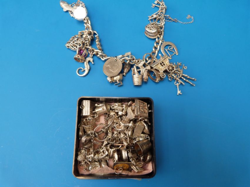 A silver charm bracelet with various charms on with a further collection of charms (over 30)